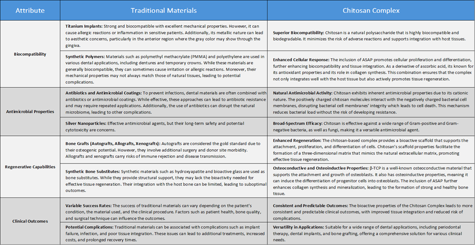 Here on the following page is a table comparing the Chitosan Complex with traditional materials in dental applications:
